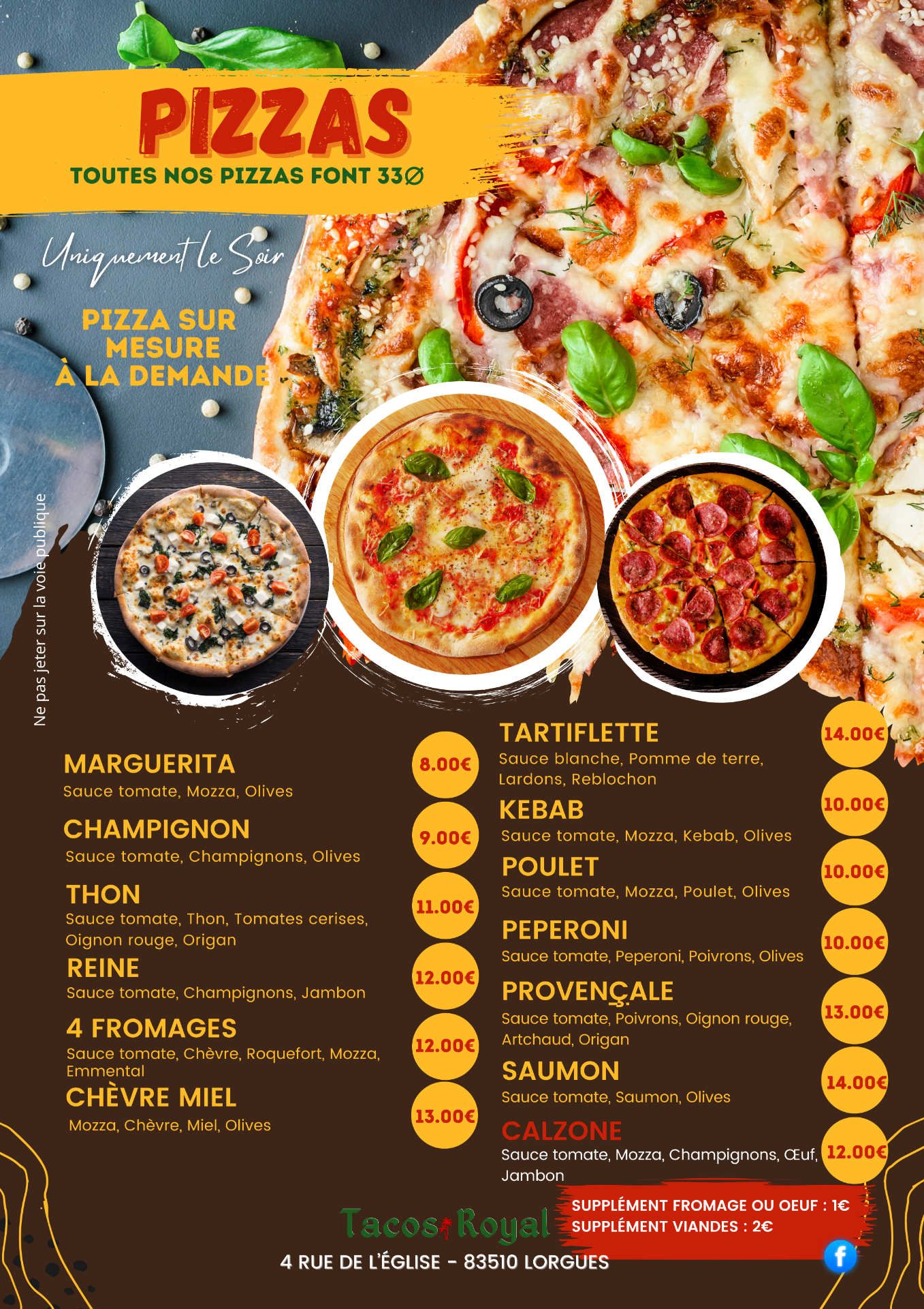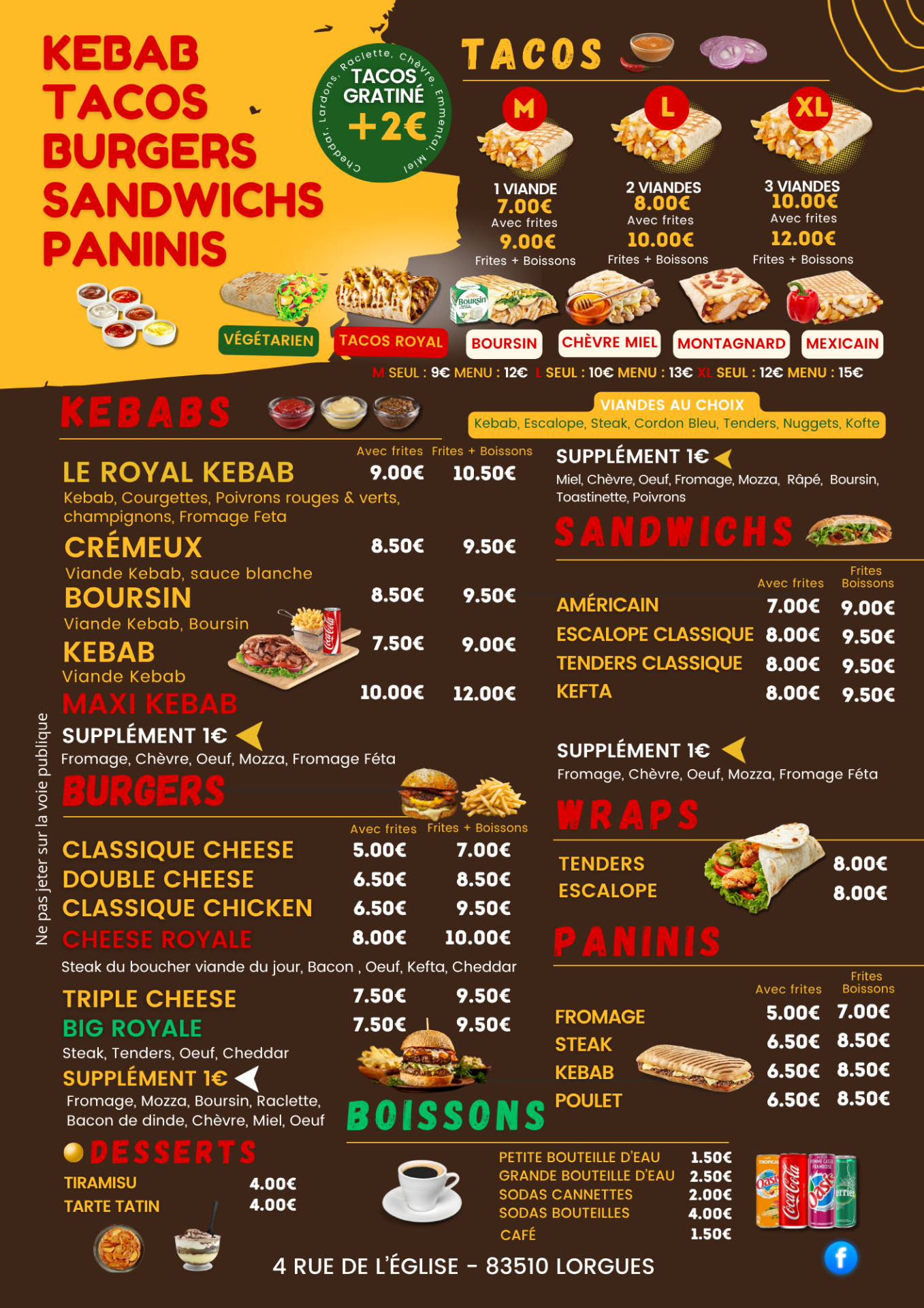 Situé au centre ville, 4 rue de l'église à Lorgues (VAR), à droite de la Collégiale, votre fast-food Tacos Royal vous reçoit