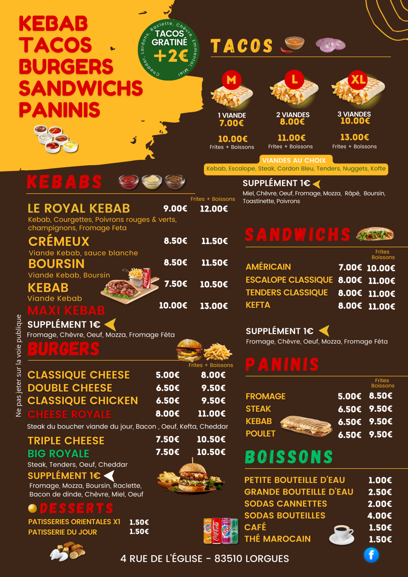 Situé au centre ville, 4 rue de l'église à Lorgues (VAR), à droite de la Collégiale, votre fast-food Tacos Royal